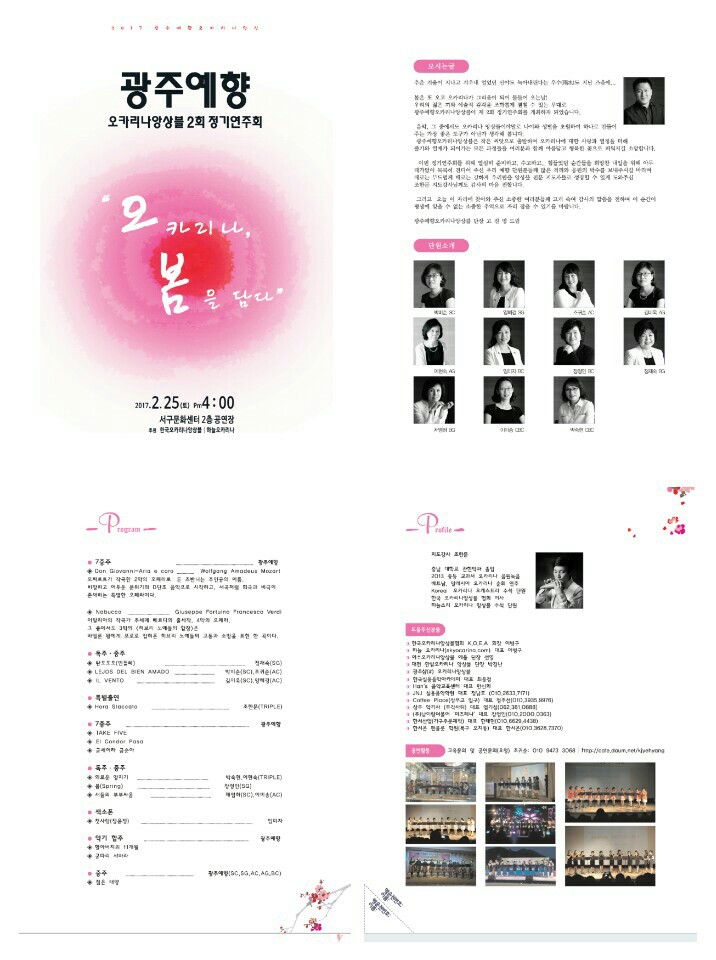 광주예향 오카리나앙상블 제2회 정기연주회가 2017년 2월 25일 토요일 늦은 4시에 서구문화센터2층 공연장에서 진행됩니다.