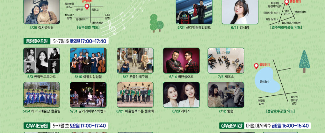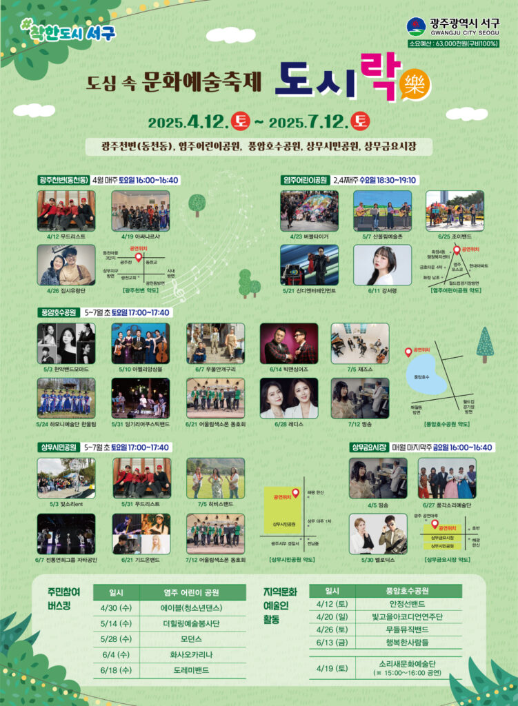 광주서구에서 주최한 도심속 문화예술축제 도시락 공연은 2025년4월12일 부터 7월12일까지 광주천변(동천동), 염주어린이공원, 풍암호수공원, 상무시민공원, 상무금요시장 에서 진행되었다. 광주천변(동천동)에서는 토요일오후4시부터 4시40분까지 3팀의 공연이 진행되었다. 4월12일 무드리스트, 4월19일 아싸나르샤, 4월26일 집시유랑단이 공연하였다. 염주어린이공원에서는 수요일 오후6시30분부터 7시10분까지 5팀의 공연이 진행되었다. 4월23일 버블타이거, 5월7일 산울림예술촌, 6월25일 조이밴드, 5월21일 신디엔터테인먼트, 6월11일 강서령 이 공연하였다. 세번째 장소인 풍암호수공원에서는 토요일 오후5시부터 5시40분까지 10팀의 공연이 진행되었다. 5월3일 현악밴드모마드 5월10일 아멜리앙상블, 5월24일 하모니예술단 한울팀, 5월31일 딩기리어쿠스틱밴드, 6월7일 우물안개구리, 6월14일 빅밴싱어즈, 6월21일 어울림색소폰동호회, 6월28일 레디스, 7월5일 재즈스, 7월12일 띵송이 공연하였다. 상무금요시장에서는 금요일오후4시부터 4시40분까지 3팀의 공연이 진행되었다. 4월5일 띵송, 5월30일 멜로딕스, 6월27일 풍각소리예술단이 공연하였다. 마지막장소인 상무시민공원에서는 토요일 오후5시부터 5시40분까지 6팀의 공연이 진행되었다. 5월3일 빛소리ent, 5월31일 무드리스트, 6월7일 전통연희그룹 자타공인, 6월21일 기드온밴드, 7월5일 히비스밴드, 7월12일 어울림색소폰 동호회가 공연하였다. 5곳의 장소에서 25팀의 팀들이 공연하였다. 많이 다른 다양한 팀들의 공연이 도심속 다른 장소에서 다른 시간에 진행되어 지역민들에게 다채로운 경험을 줄 수 있었을 것으로 생각된다.