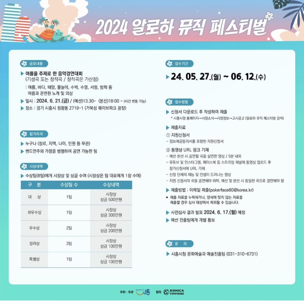 시흥 거북섬에서 펼쳐지는 하와이안 문화축제는 2024년 6월21일 금요일부터 22일 토요일까지 진행되었다. 국내외 초청 아티스트 및 하와이 뮤직공연, 하와이문화체험, 다양한 플리마켓, 하와이 먹거리, 영화상영 등으로 시흥시 거북섬 별빛공원 일원에서 진행되었다. 21일 금요일은 여름을 주제로 한 알로하 뮤직 경연대회가 진행되었다. 동영상심사로 선발된 12팀이 금요일 오후1시30분에 경연을 한 후 본선에 든 7팀이 같은날 오후6시에 경연을 하였다. 대상1팀, 최우수상1팀, 우수상2팀, 장려상3팀 그리고 특별상(알로하상)1팀에게 수상하였다. 22일 토요일 행사는 우천관계로 안타깝게 진행되지 못하였다.