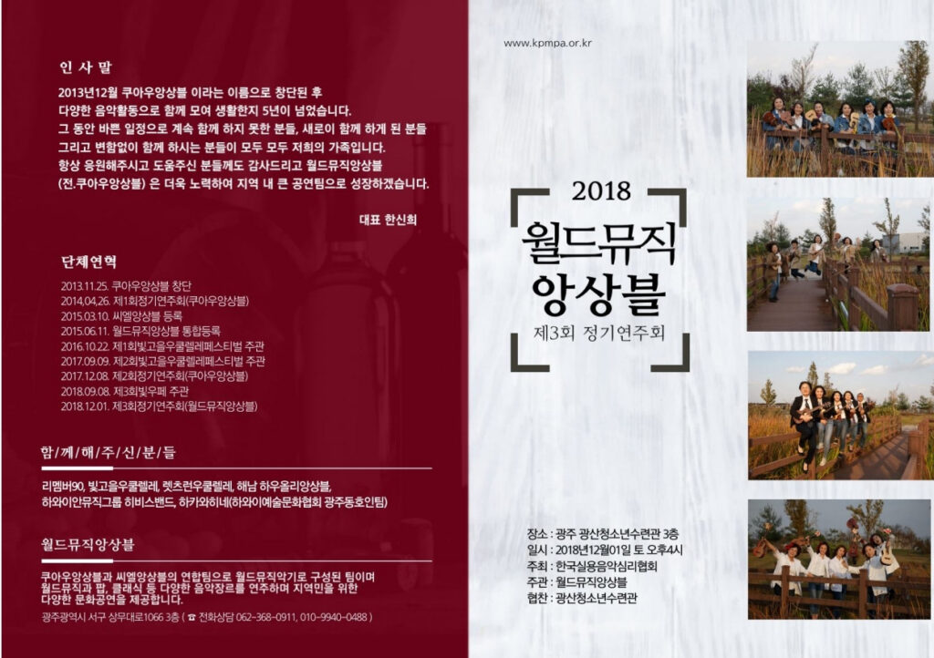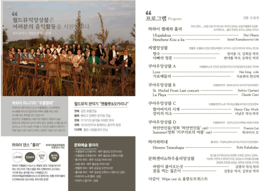 2013년부터 활동해 오던 광주의 우쿨렐레앙상블인 쿠아우앙상블이 “월드뮤직앙상블” 이름으로 제3회 정기연주회를 진행하였다. 우쿨렐레 총4팀(월드뮤직앙상블, 전쿠아우앙상블)에 오카리나팬플룻팀인 씨엘앙상블 그리고 하와이음악을 연주하는 히비스밴드와 훌라댄스를 추는 하카와히네 가 함께 공연하였다.