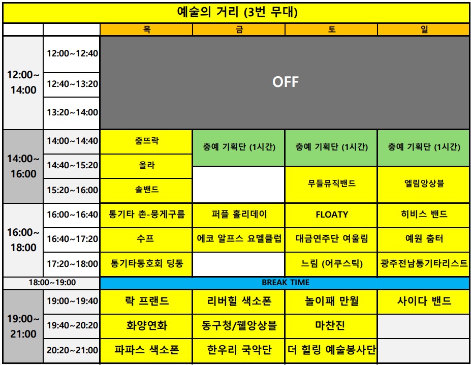 2024년 광주충장축제는 10월2일 수요일에 개막하여 3일 목요일은 감성의날 로 4일 금요일은 열정의날 그리고 5일 토요일은 행진의날 마지막 6일 일요일은 폐막식으로 진행되었다. 이번 충장축제는 참여형축제, 매일 새로운 테마, 지역의 역사와 문화반영 이라는 특징을 가지고 있다고 한다. 올해로 벌써 21번째인 광주 추억의 충장축제는 “충장발光(광)”라는 큰 주제를 가지고 광주 동구 충장로와 금남로 일대에서 펼쳐졌다.