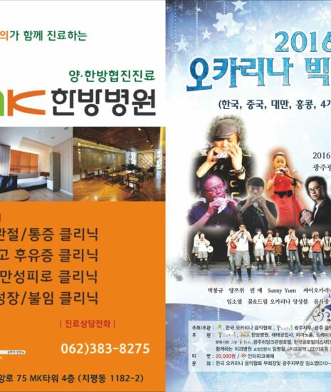 2016 오카리나 빅 콘서트(한국,중국,대만,홍콩4개국 교류) 일시 : 2016년 1월 30일(토) 오후6시 장소 : 광주광역시 서구문화센터(금호동) 주최,주관 : 한국 오카리나 음악협회, 오카리나숲 광주지부, 광주 음악교육협의회 문의 : 한국 오카리나 음악협회 부회장 및 광주지부장 임소엽(010-4655-3070)Continue Reading