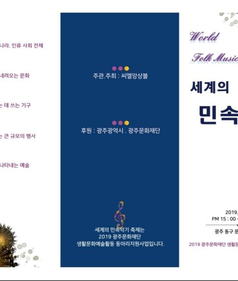 광주문화재단 생활문화예술 동아리 지원을 받아서 씨엘앙상블이 2019년도에 진행한 세계민속악기축제 는 광주광역시 동구 동명동 에 위치한 복합문화공간인 천칭자리 에서 진행되었다. 총3회로 진행된 행사는 세계의 민속악기를 연주하는 지역내 팀들과 연합으로 진행되었으며 만돌린팀인 띠아모만돌린, 하모니카팀인 하닮, 봉고팀인 마르틸로, 아코디언팀인 코스모스아코디언, 오카리나팀인 예향오카리나, 우쿨렐레팀인 쿠아우앙상블, 그리고 행사를 주최주관하는 오카리나팬플룻팀인 씨엘앙상블 이 함께 하였다.Continue Reading